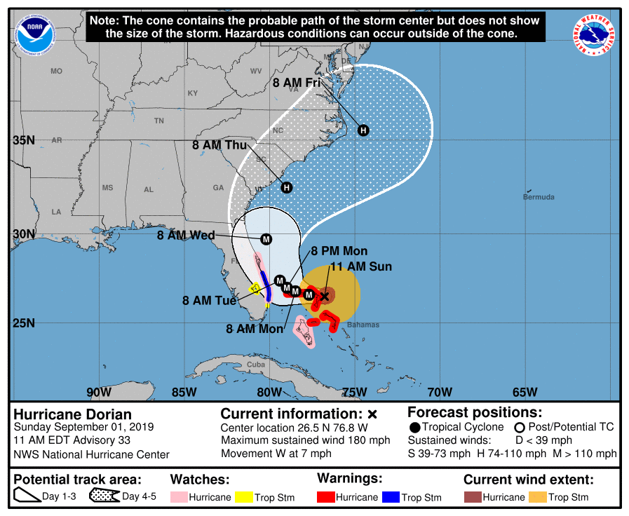 As of 11 a.m. EDT Sunday, Dorian was located about 205 miles east of West Palm Beach, Florida; 20 miles east of Great Abaco Island in the Bahamas; packing winds of 180 mph with higher gusts and was moving west at 7 mph.