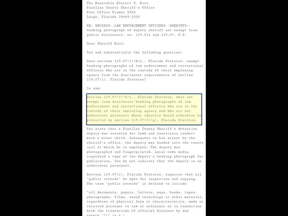 Sheriff Billy Woods, despite the Attorney General stating that law enforcement can only have photos withheld from the public if it pertains to employment, refuses to release booking photos. The AG’s office has made it clear that booking photos of a law enforcement officer who has been arrested are not protected by Florida Statute.