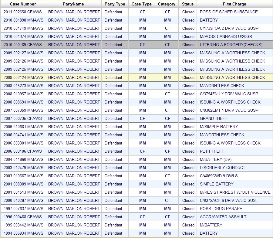 Brown had been arrested more than a dozen times. He has had 18 misdemeanor charges, five felony charges, and three felony convictions.
