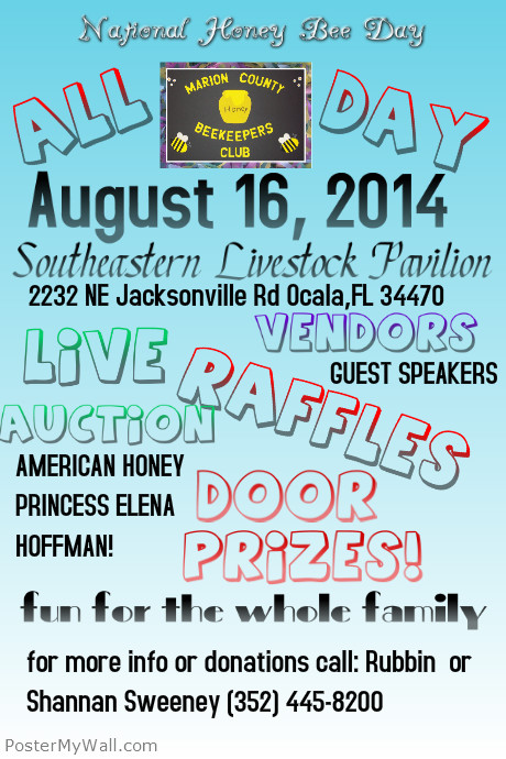 Ocala, Florida — The Marion County Beekeepers Club will be hosting the 2014 National Honey Bee Day Event in Ocala. The event will be held at the Southeastern Livestock Pavilion on August 16, 2014.